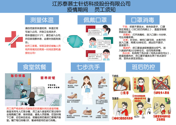 復(fù)工就是穩(wěn)就業(yè),復(fù)產(chǎn)就是穩(wěn)經(jīng)濟(jì)。如何能夠既防得了疫情,又保證人心穩(wěn)定,安全復(fù)工,就成了擺在泰慕士面前最現(xiàn)實(shí)的問題。疫情發(fā)生后,公司迅速成立防控指揮部,緊急制定防控機(jī)制和應(yīng)急預(yù)案,從人員健康管理、交通防護(hù)、就餐防護(hù)等方面都作出了明確要求,根據(jù)疫情發(fā)展情況,不斷升級和完善防控措施。并且,公司嚴(yán)格部署四級防控管護(hù)措施,從管理層到部門、班級、小組,明確責(zé)任人、層層落實(shí)、嚴(yán)防嚴(yán)控,統(tǒng)籌做好防疫相關(guān)工作。