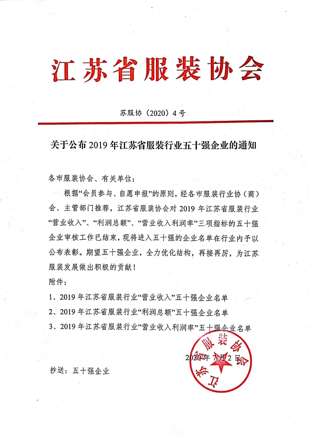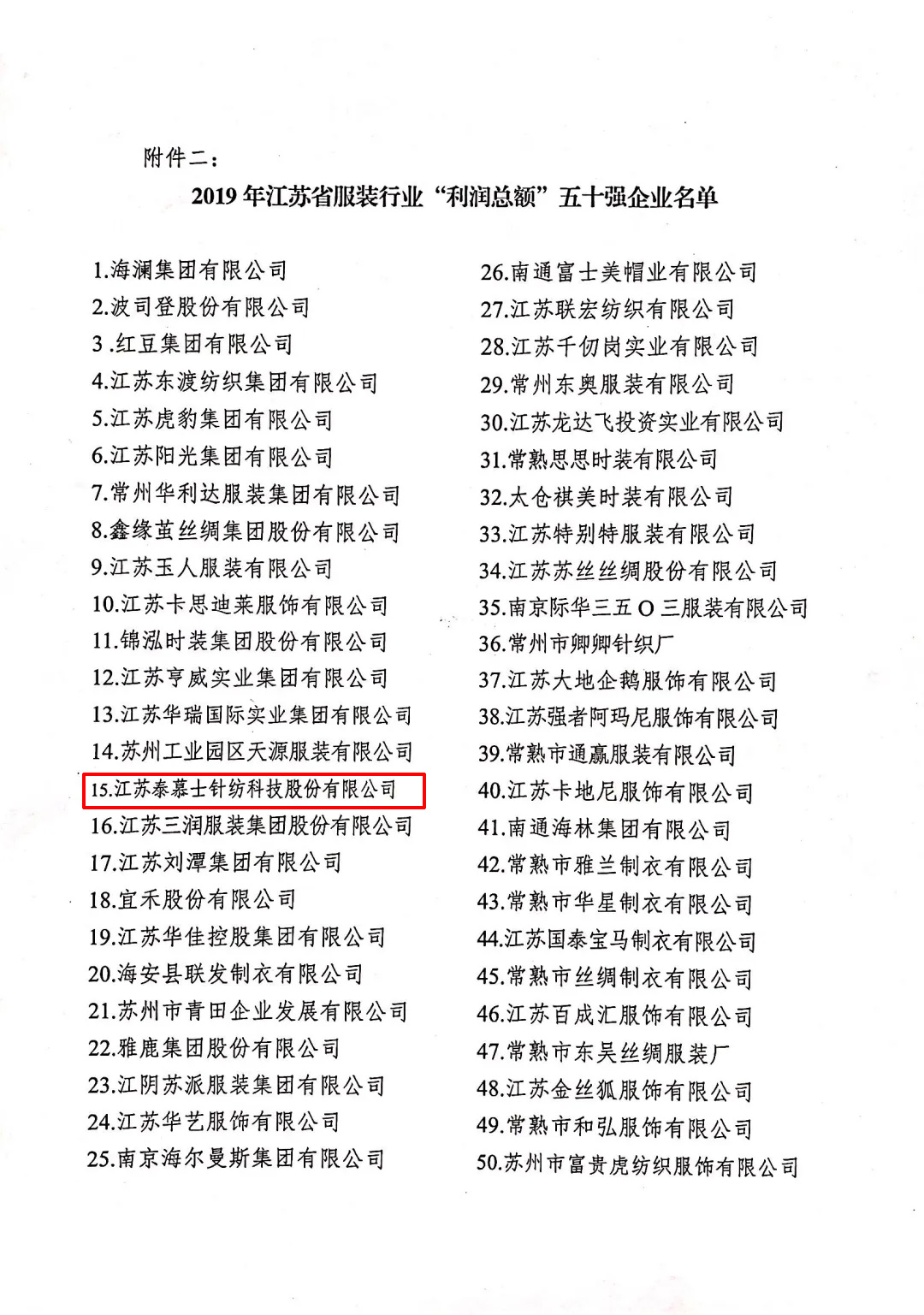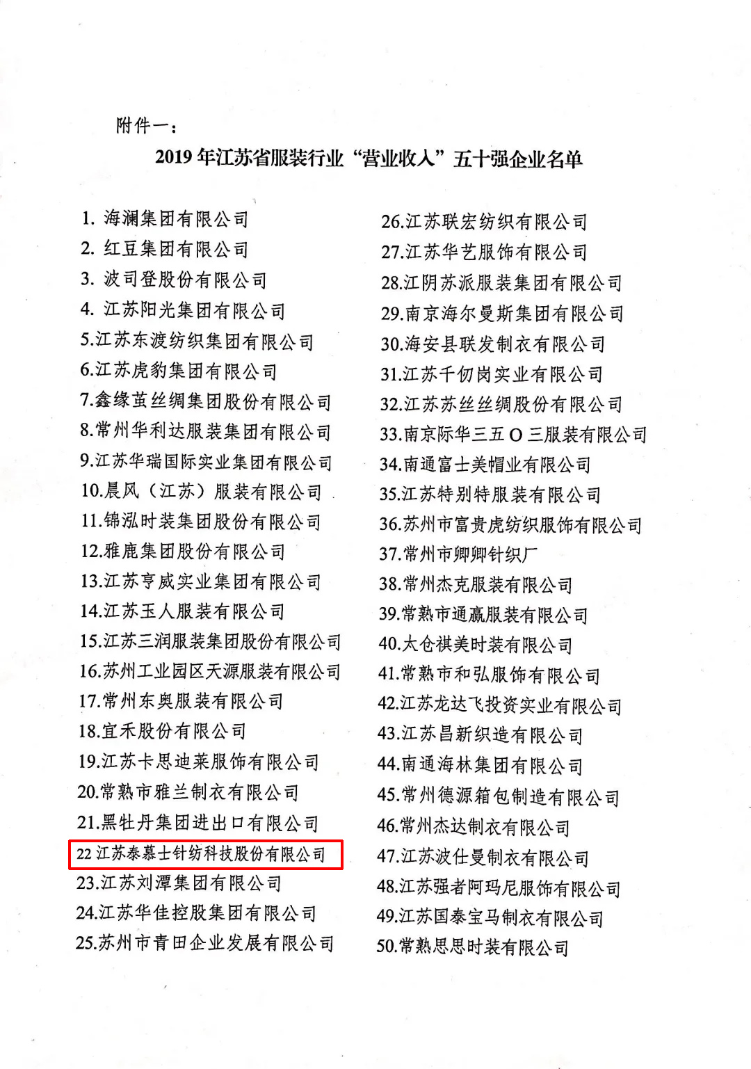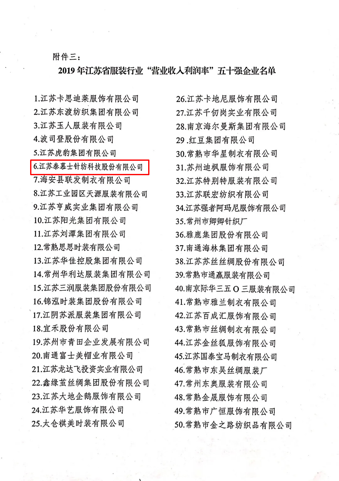 近日,江蘇省服裝協(xié)會(huì)發(fā)布了2019年江蘇省服裝行業(yè)“銷(xiāo)售收入”、“利潤(rùn)總額”和“銷(xiāo)售利潤(rùn)率”三項(xiàng)指標(biāo)的五十強(qiáng)企業(yè),泰慕士均榜上有名。