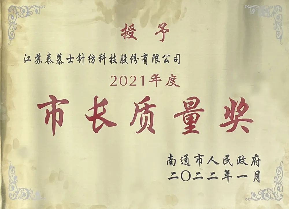 【概要描述】?日前,南通市人民政府正式發(fā)布《市政府關(guān)于授予2021年度南通市市長(zhǎng)質(zhì)量獎(jiǎng)的決定》,江蘇泰慕士針紡科技股份有限公司榮獲南通市“市長(zhǎng)質(zhì)量獎(jiǎng)”。