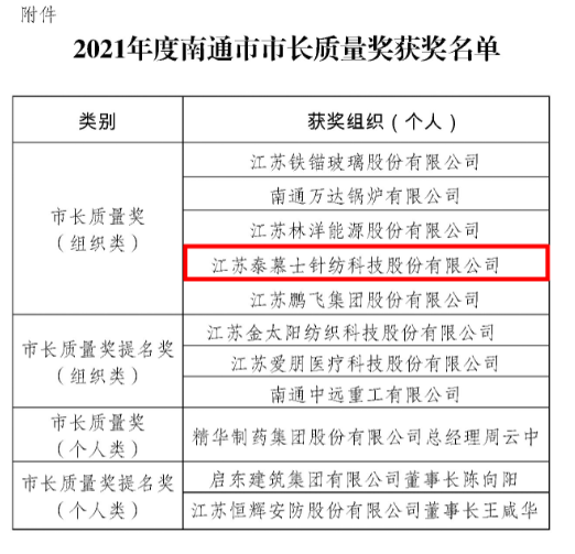 日前,南通市人民政府正式發(fā)布《市政府關(guān)于授予2021年度南通市市長(zhǎng)質(zhì)量獎(jiǎng)的決定》,江蘇泰慕士針紡科技股份有限公司榮獲南通市“市長(zhǎng)質(zhì)量獎(jiǎng)”。